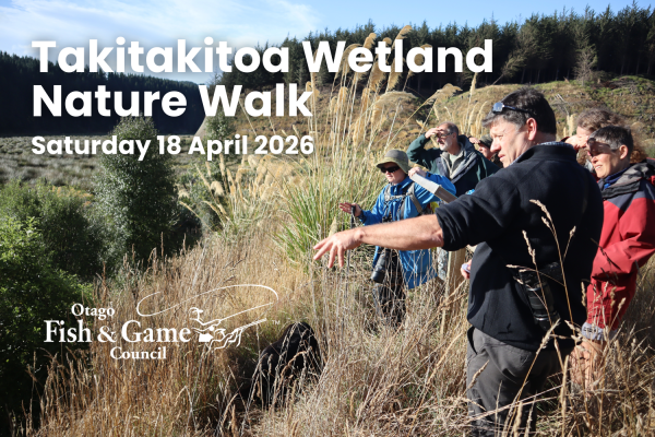 Take a guided nature walk at Takitakitoa Wetland, in the lower Taieri, about 30 minutes’ drive south of the Dunedin CBD. Join Otago Fish & Game on a walk to discover the rich biodiversity of this regionally significant wetland — restored, managed and funded by hunters for conservation. This event is suitable for families and nature enthusiasts highlighting the importance of wetland conservation in Otago.