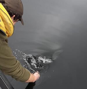 Harrison Calder carefully releasing a undersize salmon. (Photo Baylee Kersten)