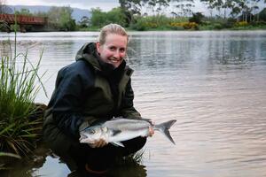 Violet Farrell netted this kahawai hooked by Chad Patrick during the soft bait clinic in the Taieri River. Photo: Bruce Quirey