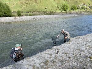Teamwork makes the dream work for Wānaka anglers Sandy Brown and Hamish Bartlett. Photo: Mason Court