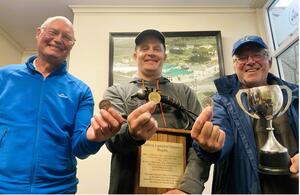 Displaying their medals and trophies at the weigh-in at the Oak Tree Inn at Clinton at the weekend (Saturday, November 4) are (from left) Bruce McGavin (bronze), Matt Pettersson (gold) and Les Gibson (silver). Photo: Bruce Quirey, Otago Fish & Game.