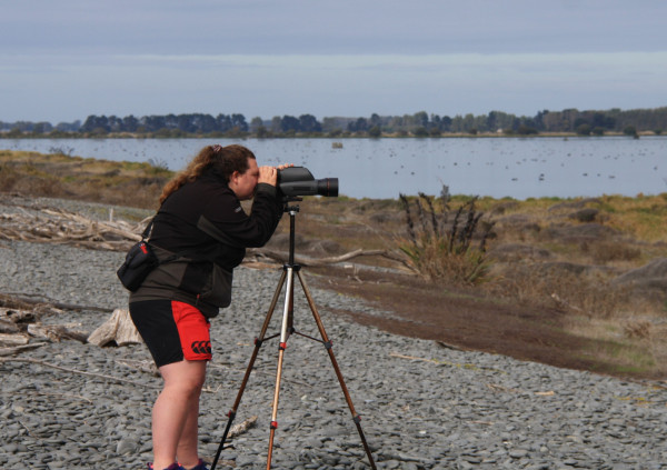 Fish & Game Officer Nikki Dellaway surveys game bird populations at Wainono Lagoon photo by Rhys Adams