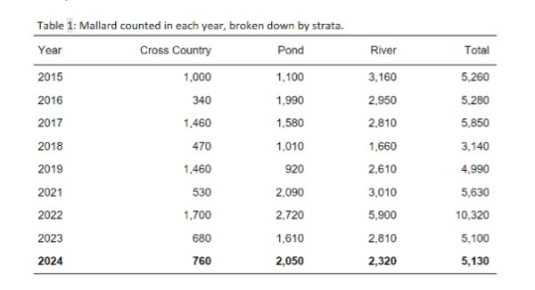 - Birds appeared to be more evenly distributed this year, with only 16 sites containing no ducks, below the average of 19 and the highest result at 25.
