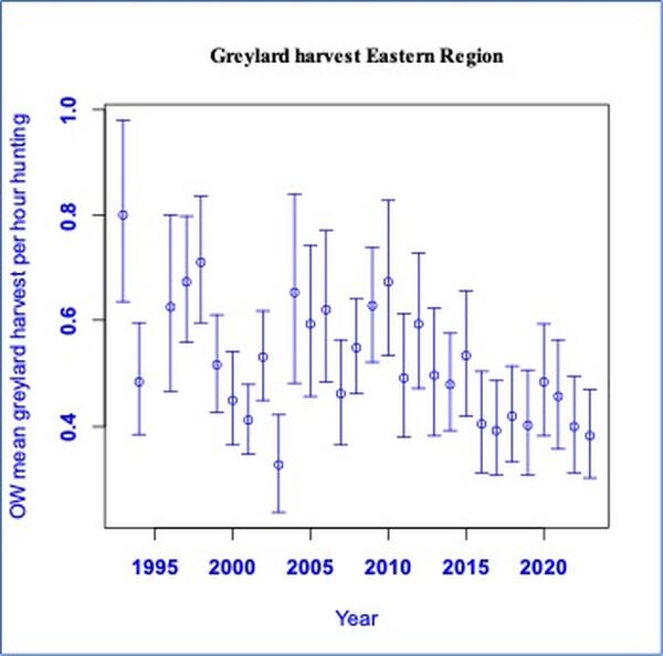 Mallard and grey duck (greylard) shot per hour hunting waterfowl in the Eastern Region 1993 – 2023