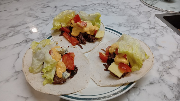 The meat goes well with fresh vegetables like lettuce, tomatoes and carrot, the contrast of the meat and the fresh vegetables really works. I also add cheese and sauces of choice.